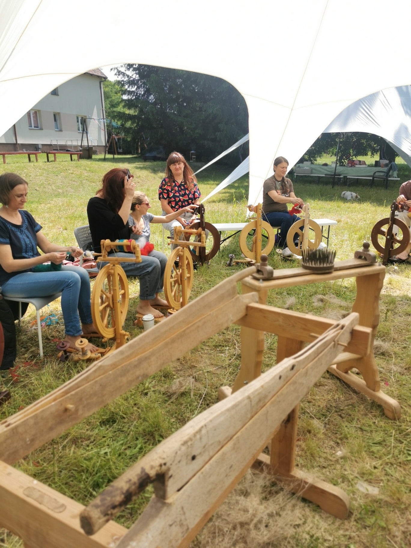 *Nauka przędzenia wełny i włókien roślinnych (obsługa grępli, kołowrotka, przędzenie pojedynczej nici, dwojenie, zwijanie na motowidło), będziemy prząść każdego dnia, by się nauczyć